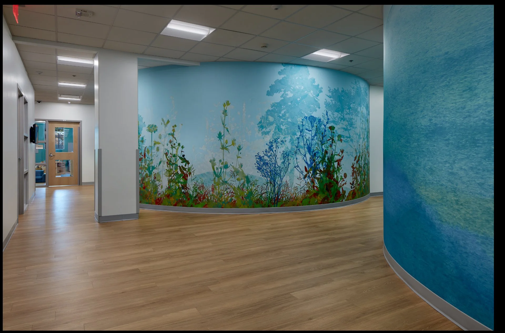 Hallway with colorful wall mural of plants and trees, wood flooring, and overhead lighting in a building interior.