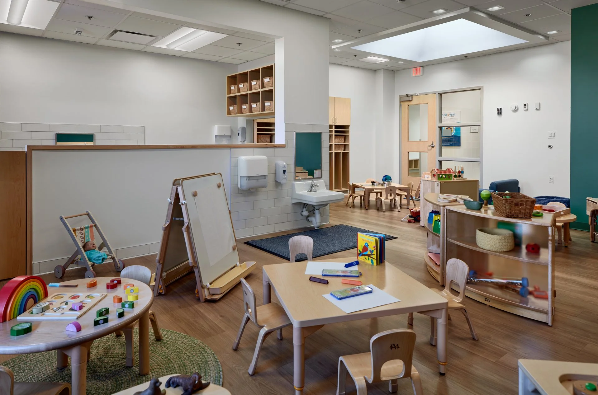 Preschool classroom with small tables and chairs, educational toys, and art supplies; features include a doll stroller, easel, and sink.