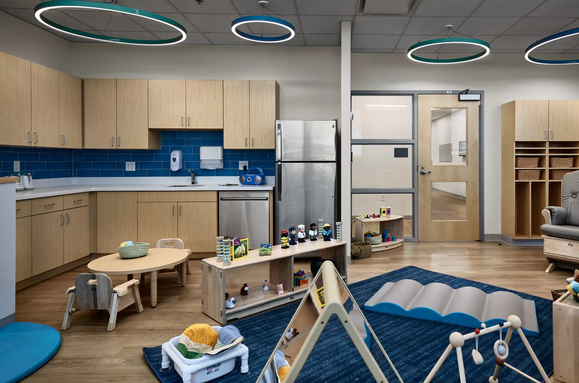 A modern daycare or preschool room with wooden cabinets, blue tile backsplash, stainless steel refrigerator, and play equipment like miniature tables, chairs, and toys on a shelf. The room features circular ceiling lights and wood flooring. A door with glass panels is in the background.