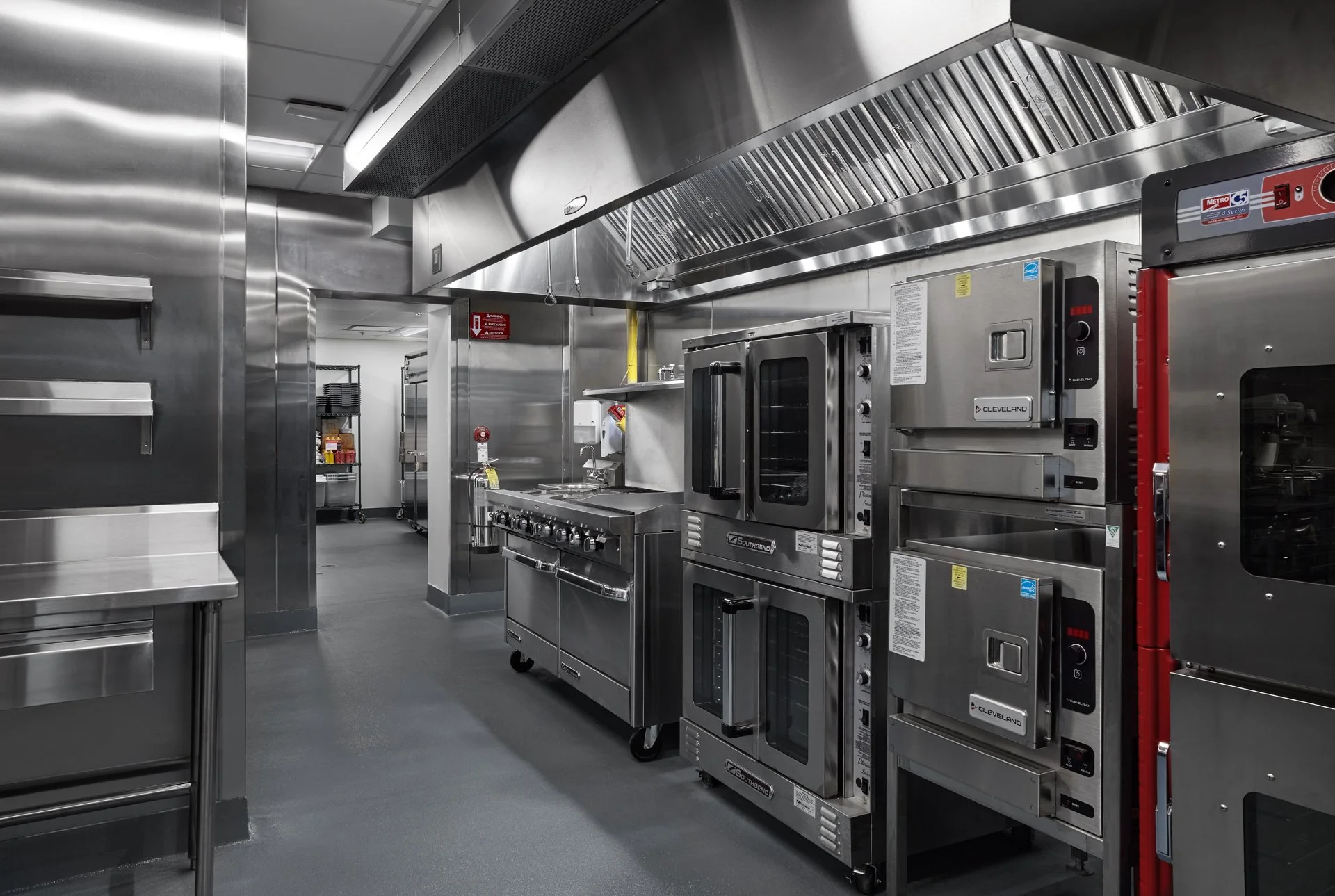 Industrial kitchen with stainless steel appliances, including ovens, stove, and ventilation system.