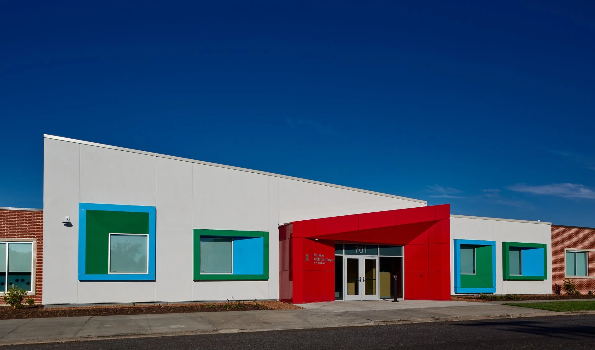 Colorful modern building exterior with geometric shapes and a red entrance.