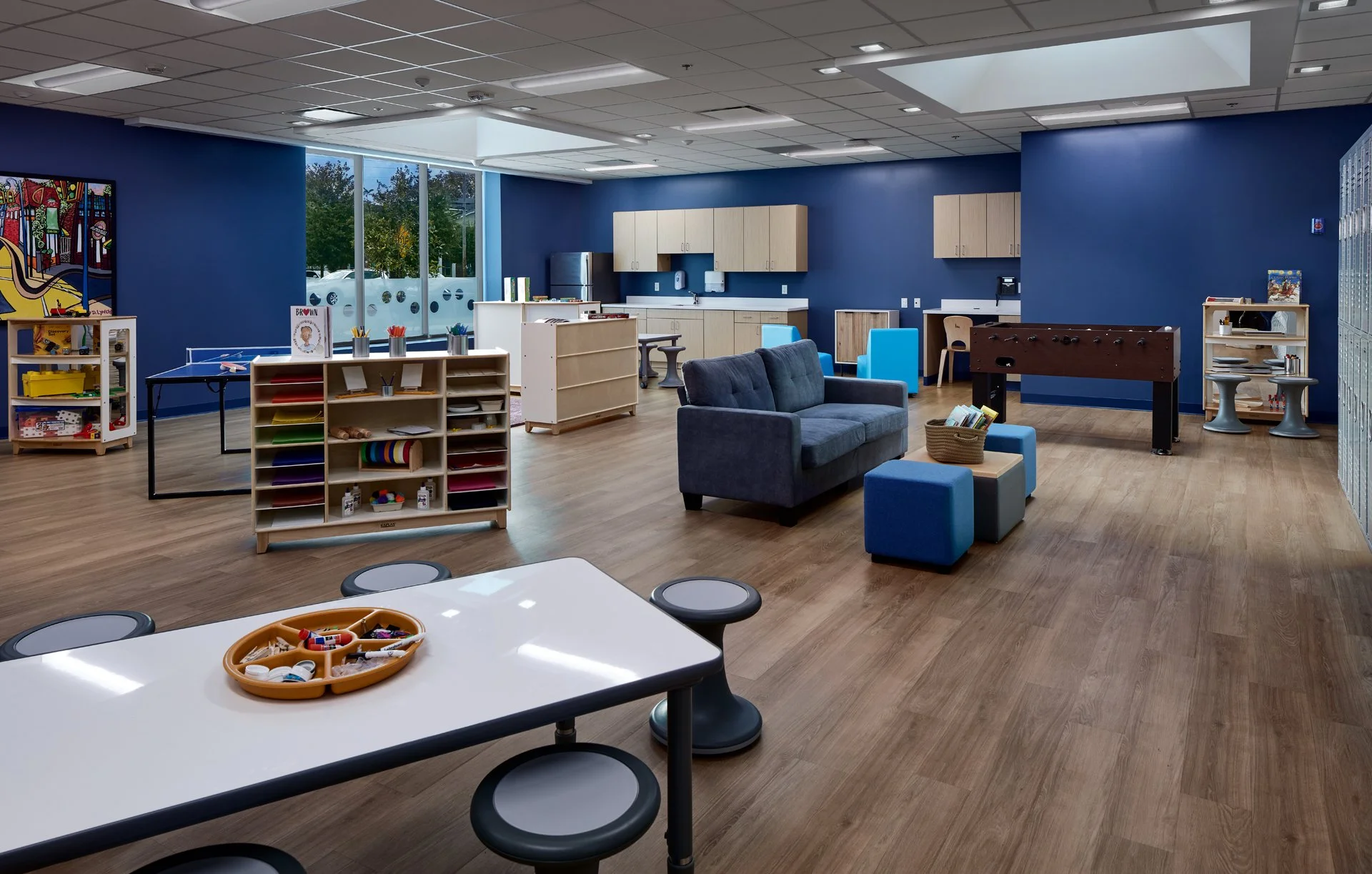 A spacious playroom with dark blue walls featuring a variety of activity areas, including a table with stools, a couch, a foosball table, shelves with art supplies, and a locker area. The room has a wooden floor and large windows with natural light.