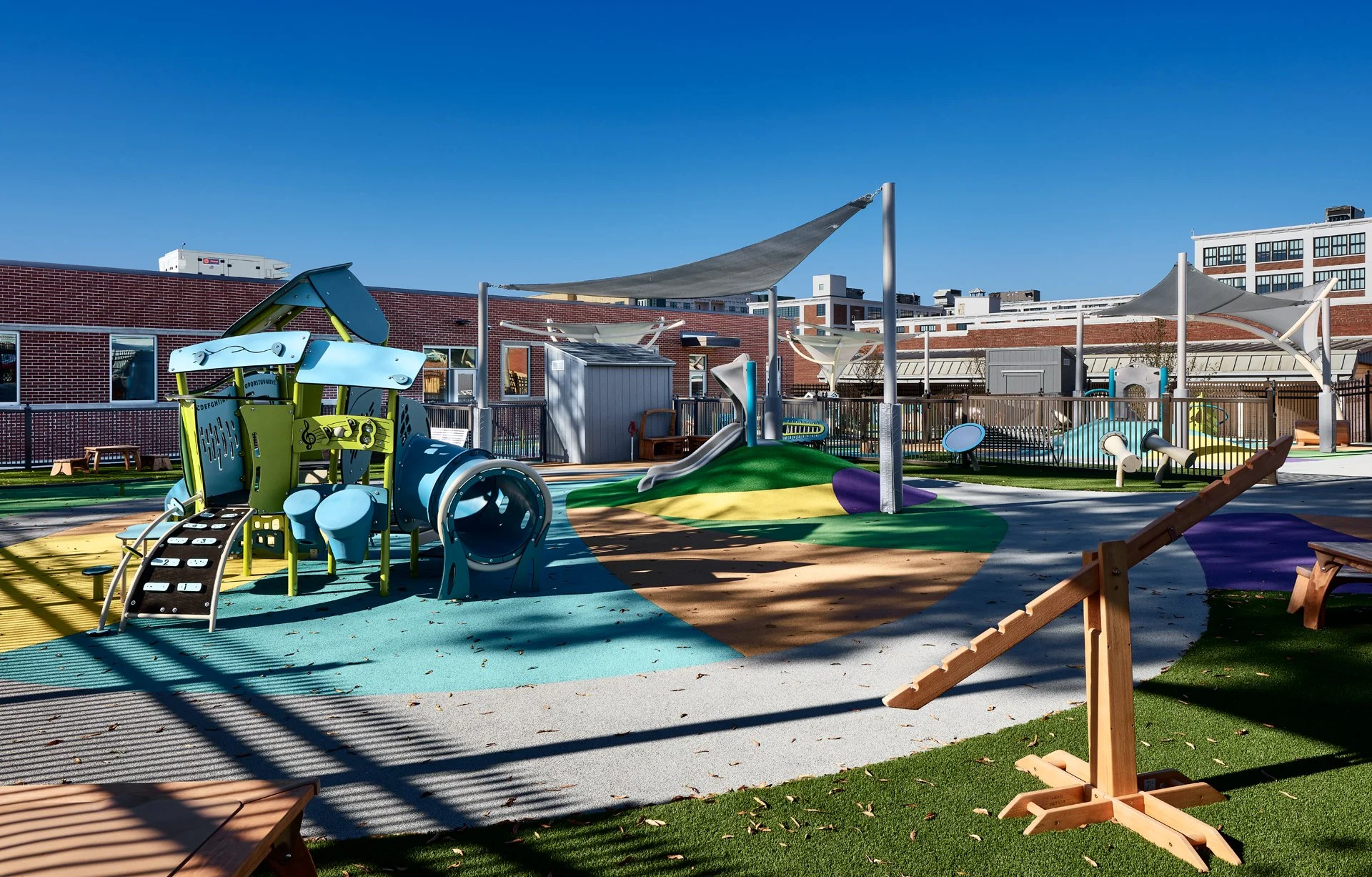 Colorful playground with slides, climbing structures, and shade sails on a sunny day.