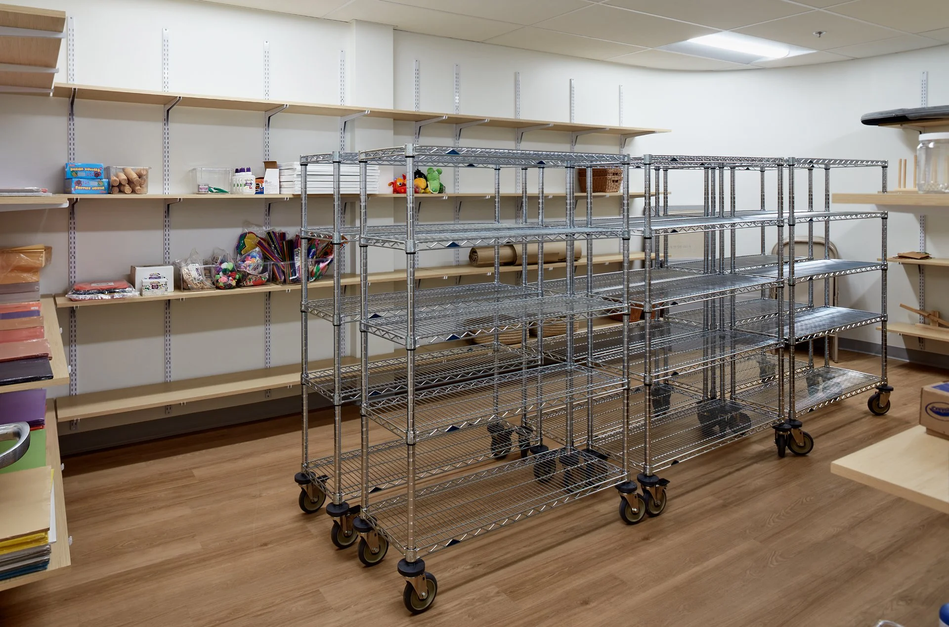 Storage room with metal wire shelving units, wooden shelves on the walls, and various supplies like paper and crafts. The floor is wooden, and the room is well-lit with overhead lights.