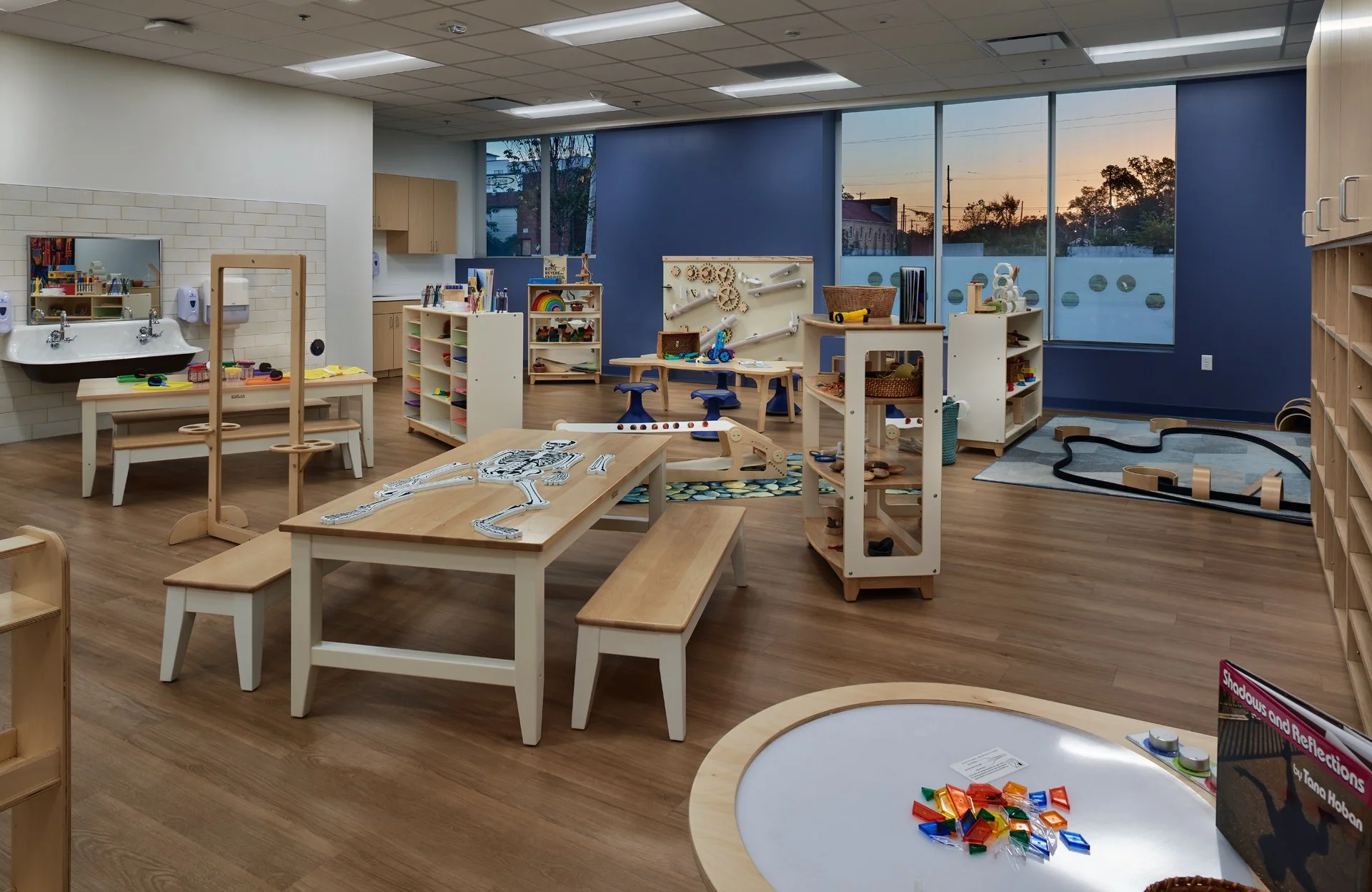 A well-organized classroom with wooden furniture and educational toys. Tables and benches are arranged neatly, with a skeletal puzzle displayed on one table. Shelves and cabinets hold various materials like art supplies and learning tools. A play mat with a road pattern and window view of a sunset are visible. The atmosphere is inviting and conducive to learning.