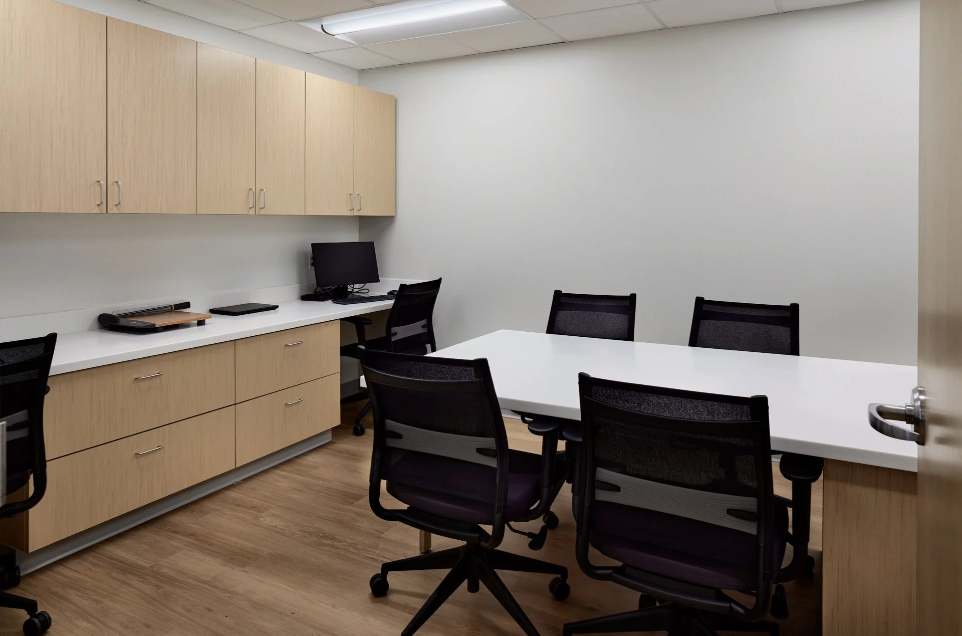 Conference room with a table, six office chairs, wooden cabinets, a computer, and a printer.