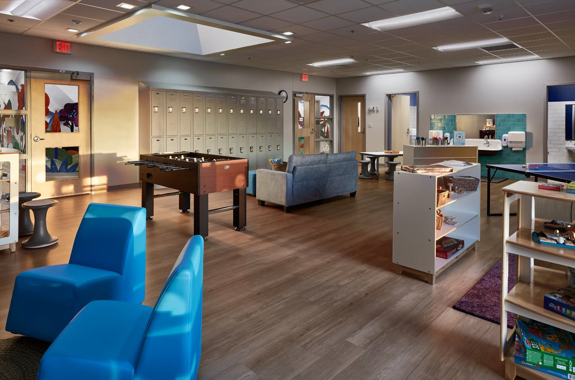 Youth recreation room with lockers, foosball table, blue chairs, gray sofa, shelving, and a table tennis setup. Walls feature artwork, and there are sinks along one wall. The room is well-lit with a ceiling skylight.